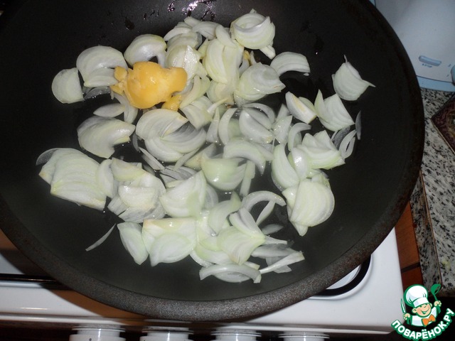 На сковороду налить немножко растительного масла, выложить лук полукольцами, сливочное масло, чуть посолить и обжарить до золотистого цвета.