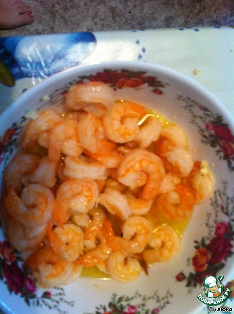 Смешали в миске оливковое масло, сок 1-го лимона и выдавленный чеснок. Отварили креветки (у меня были очищенные) и отправили их в маринад на несколько минут.