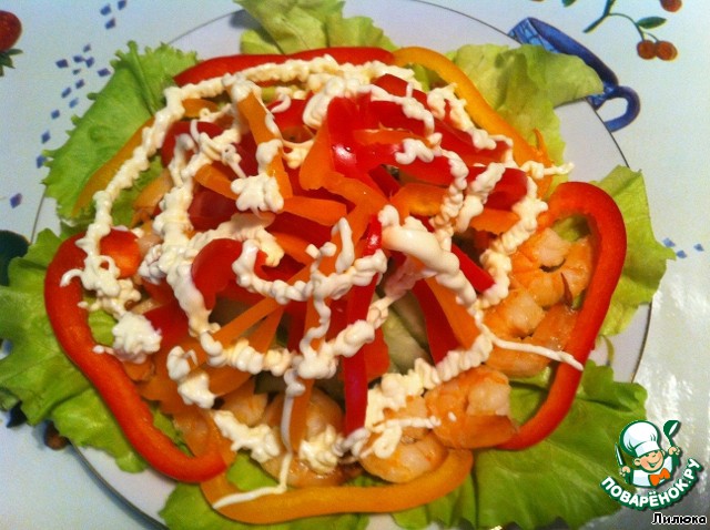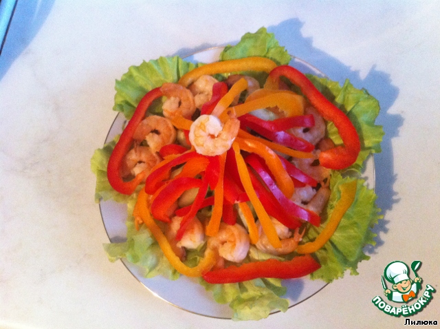 Примечание: Так как салат порционный, то количество креветок в порции каждый определяет сам для себя. Также можно брать три перца (красный, желтый и зеленый)