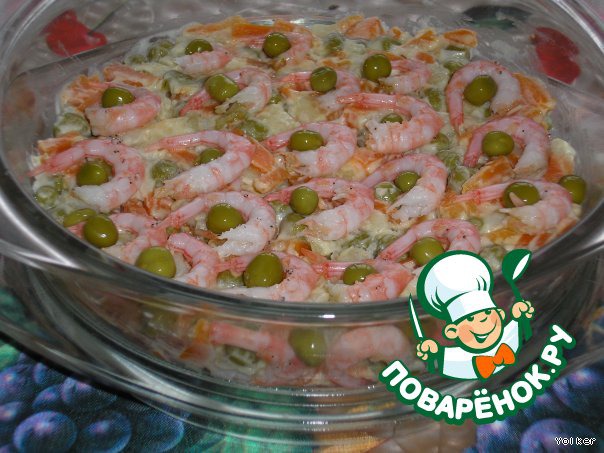 Отвариваются креветки, чистятся и выкладываются на дно тарелки, потом смесь из картошки, морковки и горошка (заправленные майонезом.), сверху тоже укладываются креветки.