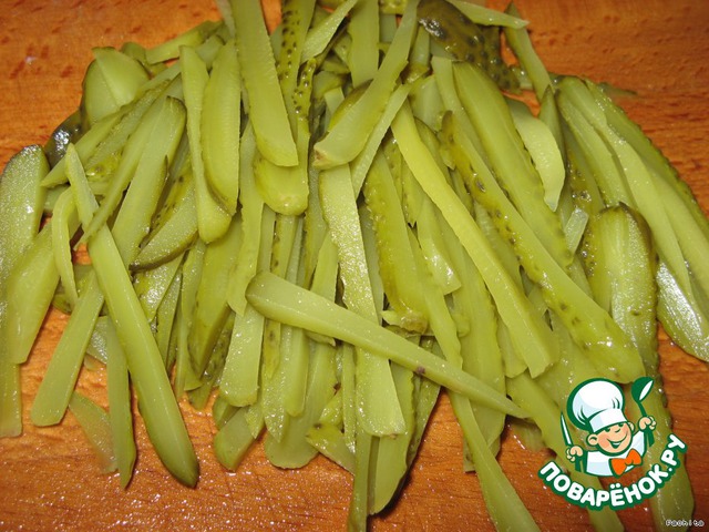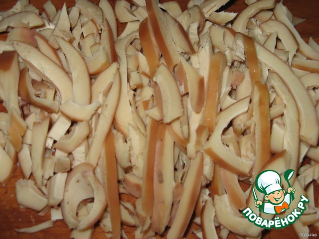 Кальмары очистить от пленки, удалить внутренности и отварить в подсоленной воде в течении 2-3 минут. Остудить, нарезать соломкой.