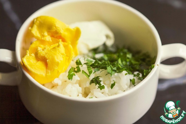 Готовый и остывший рис смешать с желтком, мелко порубленной петрушкой, рисовым уксусом и сыром филадельфия. Филадельфию можно заменить на любой другой сливочный сыр.