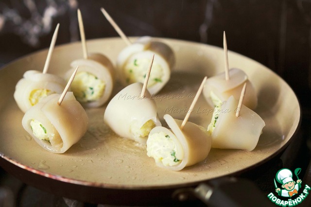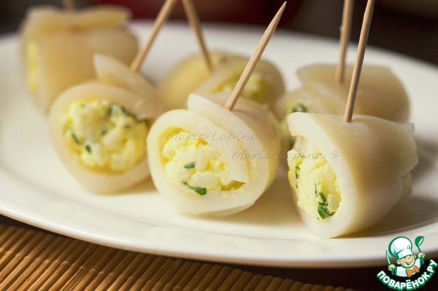 Кальмары отварить 3-4 минуты, нарезать на полоски. Завернуть в каждую полоску шарик из рисовой начинки и скрепить зубочисткой.