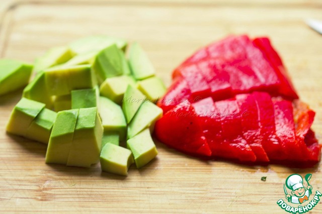 Спелый авокадо нарезать на кубики. Перец на небольшие полоски. Я использую запеченный перец без кожицы в масле. Можно запечь перец и в домашних условиях. Есть два варианта: в духовке под грилем или на газовой плите прямо на огне. Запекаем до черноты, затем кладем в целлофановый пакет, завязываем и отставляем на 5 минут. После такой процедуры кожица будет удаляться намного легче. Будьте аккуратны, перец из пакета может быть очень горячим, не обожгитесь.