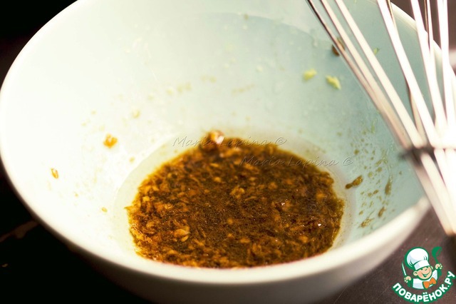 Подготовим заправку. Чеснок и свежий имбирь выдавить через пресс. Добавить соевый соус, масло, рисовый уксус. Смешать венчиком до однородной эмульсии.