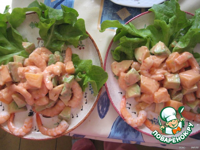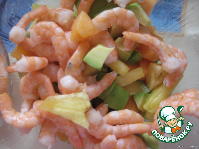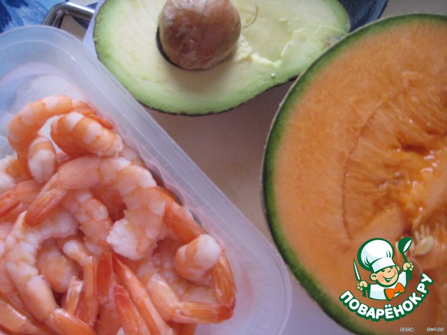 | Необыкновенно вкусный салат из креветок, авокадо, дыни и ананаса с соусом для креветочных коктейлей. Любители креветок - не проходите мимо! |