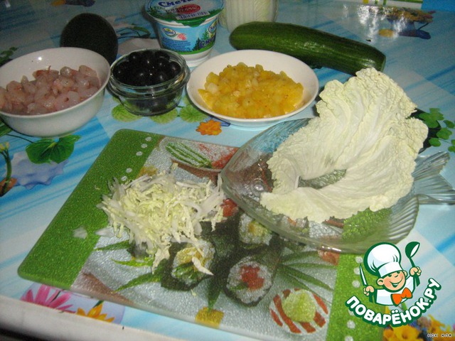 Шинкуем соломкой капусту укладываем на нашу ракушку ,сверху огурец тоже соломкой .Затем ананас нарезанный кубиком .