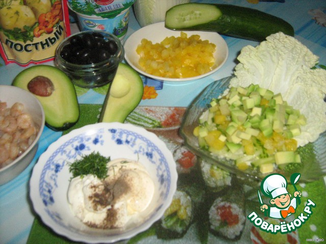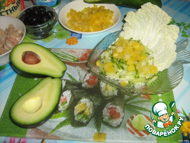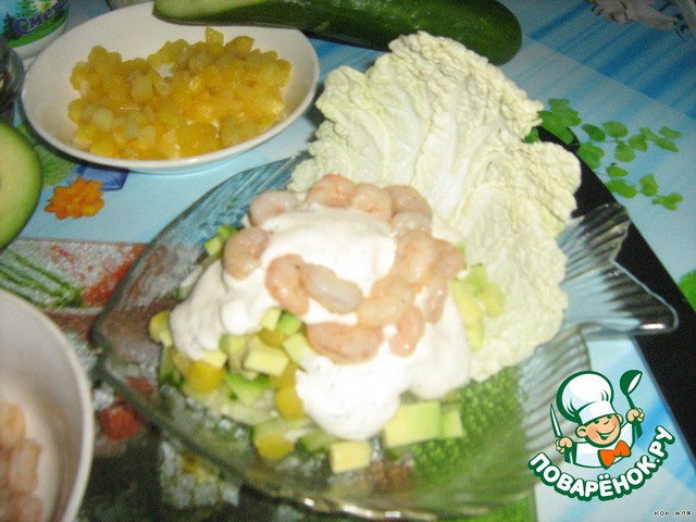 | Нежный красивый , легкий салатик с креветочками , ананасом и авокадо |