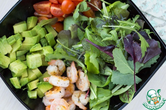 Креветки разморозить, очистить при необходимости, помыть и просушить бумажным полотенцем. На сковороде разогреть 2 ст. л. оливкового масла и обжарить креветки 2-3 минуты. Посолить и поперчить в конце готовки. Авокадо нарезать кубиком, томаты черри на четвертинки. Микс салатов помыть и обсушить.