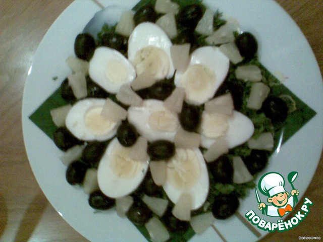 Маслины разложить поверх яиц и зелени.