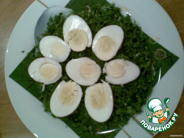 Отварные яйца нарезать лепестками и выложить поверх зелени.