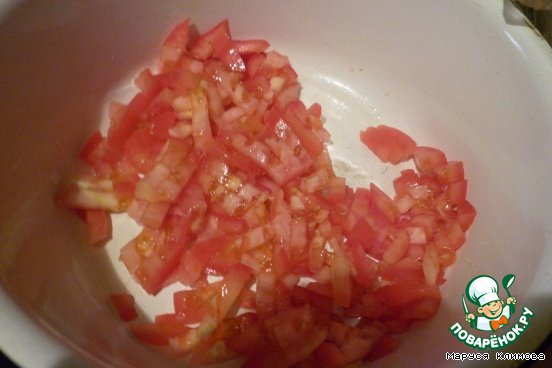 Очищенную тушку кальмара нарезать мелкими кубиками и обжарить до готовности вместе с мелко нарезанной луковицей.