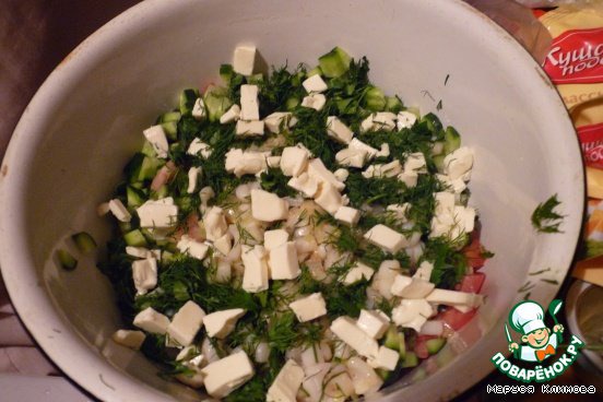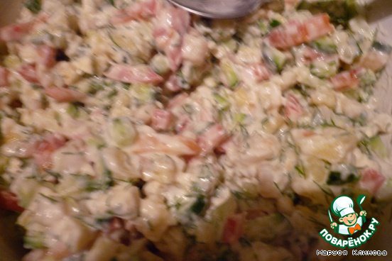 Картофель нарезать кубиками, салат посолить и заправить майонезом