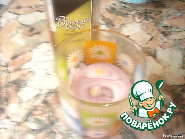 Смешать винный уксус, растительное масло и сахар; положить нарезанный тонкими кольцами лук и дать постоять около 1 часа