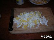 Добавляем к яйцам и кальмару нарезанную зелень.