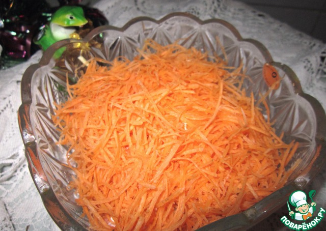 Следующий слой натертой на "корейской" терке моркови. И снова майонез. Много майонеза не надо, достаточно тонкого слоя.