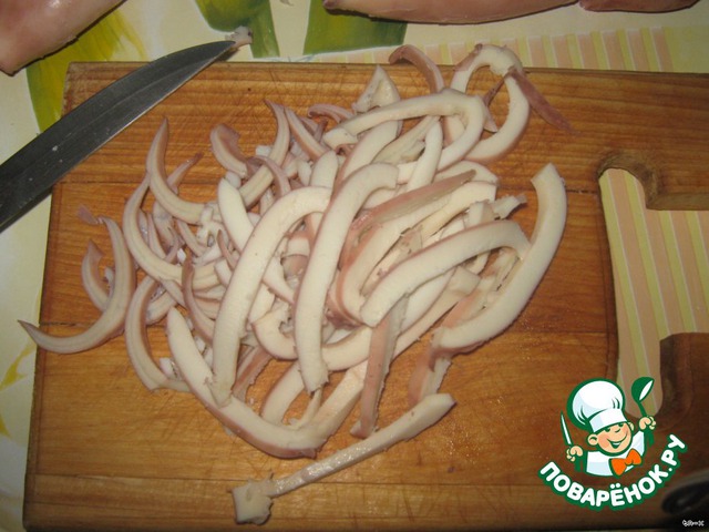 Нарезать кальмары полукольцами (если большие) или кольцами.