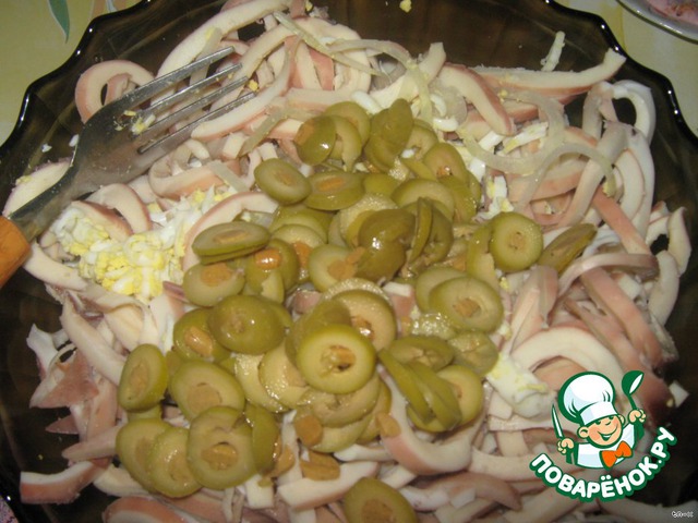 Оливки нарезать кольцами. Все ингредиенты смешать с майонезом.
