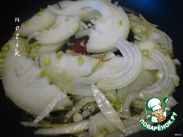 Луковицу нарезать полукольцами и обжарить в 1 ст.л. оливкового масла.