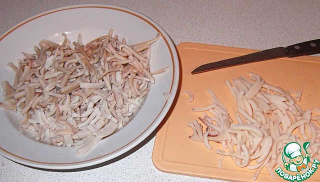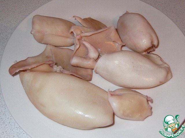 Кальмары очищаем и варим в подсоленой воде 5 минут