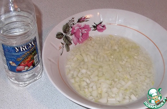 Лук нарезаем мелкими кубиками, заливаем кипятком и добавляем 2 столовые ложки уксуса. Оставляем минут на 10 в тарелке чтобы пропитался.