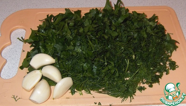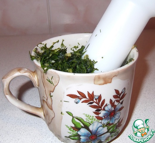 Чеснок пропускаем через чесночницу. Затем смешиваем его с мелконарезанной зеленью, добавляем соль, растительное масло, 1/2 чайной ложки красного жгучего перца и перемалываем в ступке ( или стакане ) толкушкой
