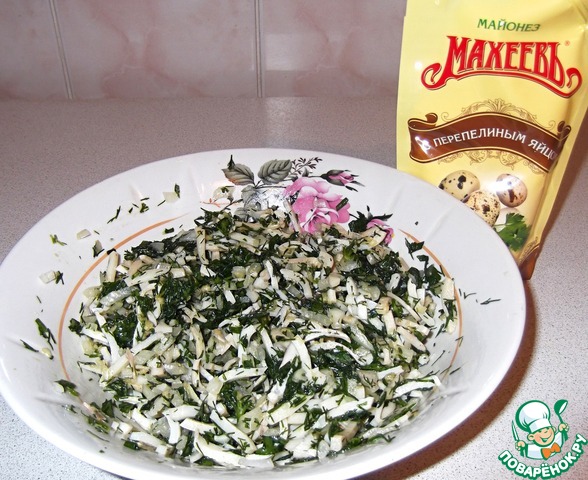 Покываем нашей начинкой, то есть кальмарами с зеленью и чесноком. Сверху ложим веточку укропа и петрушки