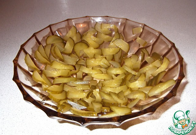 Ну а затем, нарезаем консервированный огурец так же соломкой, и укладываем в салатницу.