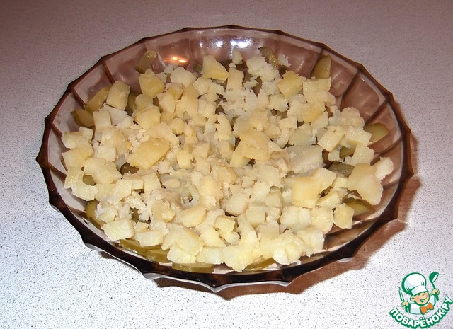 Далее отварной картофель режем кубиками и слоем покрываем наши огурчики.