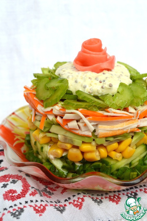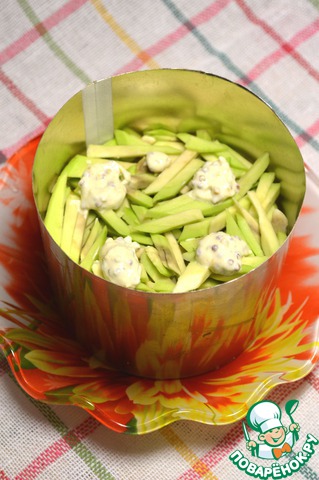 Сельдерей режем тонкими пластинами, выкладываем последним слоем. Снимаем формочку, сверху добавляем оставшийся соус, украшаем по желанию.