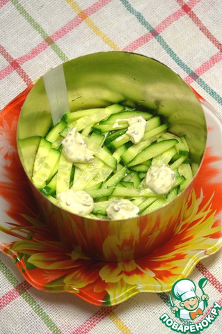 Сначала тонко нарезанный огурец, можно присолить немного, добавить немного соуса
