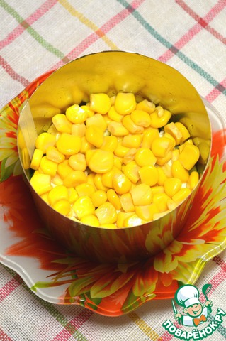 В формочку для салата выкладываем слоями все ингредиенты. Правда, у меня формочка самодельная, вырезан кусок литровой пивной банки, окрашен из баллончика краской, hаnd made, так сказать
