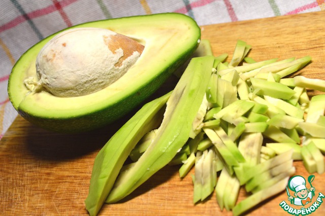 Авокадо тонко нарезаем полосками, я добавила несколько капель лимона, чтобы авокадо не потемнел быстро и не испортил вид салатика