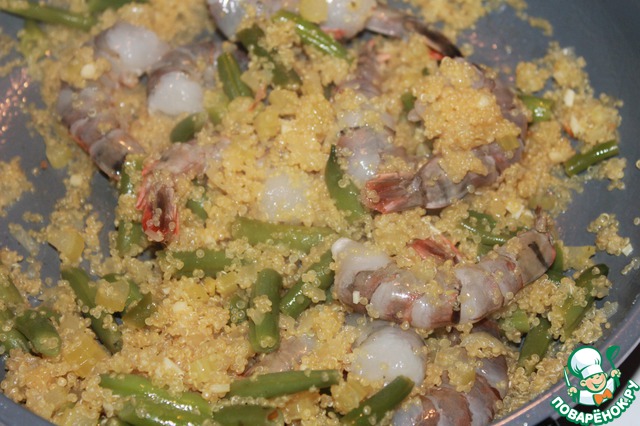 Промыть киноа, всыпать к луку, залить куриный бульон и тушить 15 минут