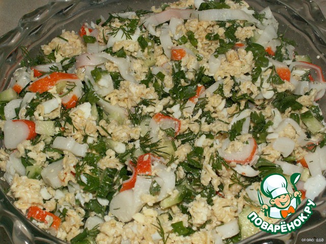 | Нашла рецептик этого салата на сайте "Повара". Решила попробовать. Неплохой вариант. Готовится проще простого. |
