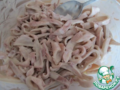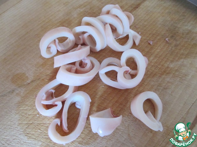 Тушки кальмара очистить и отварить в несоленой воде следующим образом - вода закипела, закладываем кальмар, закипело, вынимаем