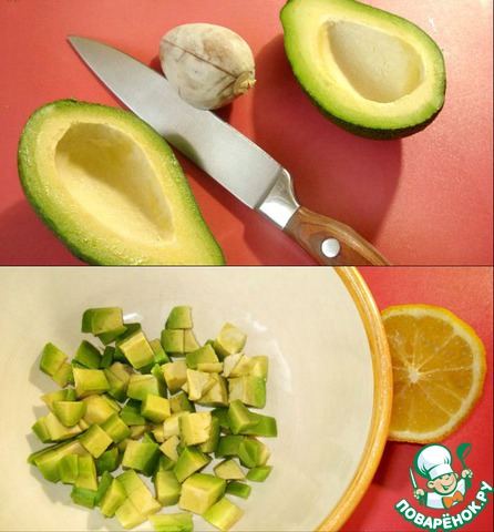 Авокадо моем, разрезаем пополам, удаляем косточку, нарезаем кубиками и сбрызгиваем лимонным соком.