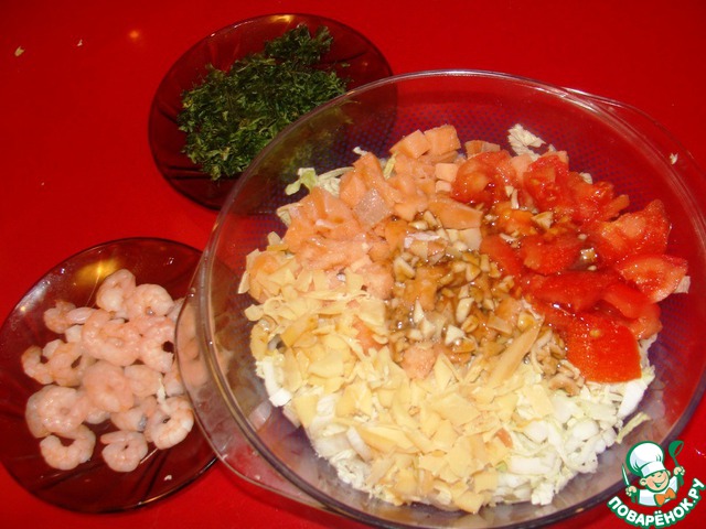 Очищенные креветки сварить до готовности. Слабосоленый лосось нарезать кубиками.