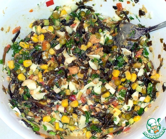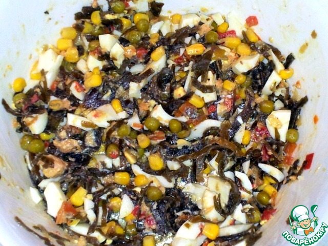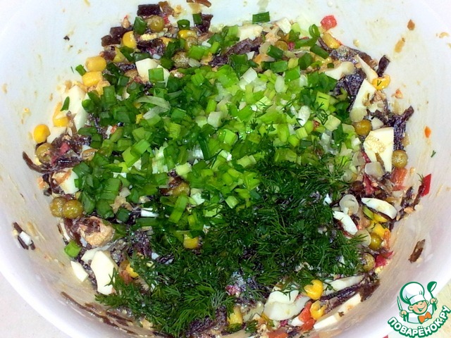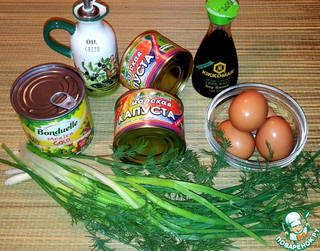 Ингредиенты - морская капуста, зелёный горошек и кукуруза консервированные, яйца, зелёный лук, укроп, оливковое масло.