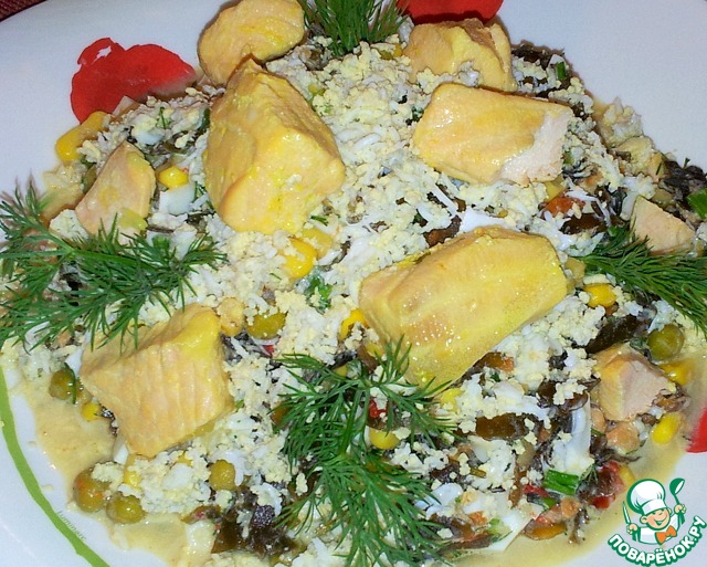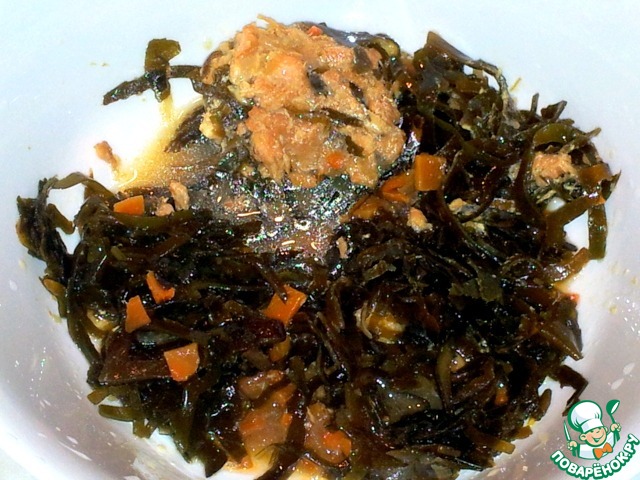 | Честно скажу, что салат с морской капустой едим редко. Если его готовлю, то капусту покупаю без добавок. В этих баночках с капустой есть лосось и немного моркови. Салат вкусный! |