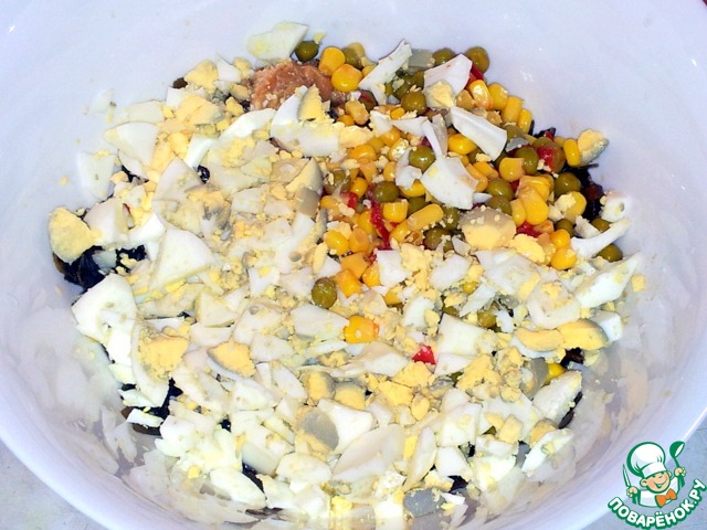 Баночку с горошком и кукурузой открыть и тоже переложить в миску. Раскрошить три яйца.