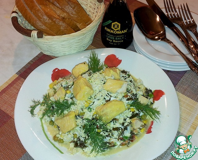 Каждый в своей тарелочке салат заправит соусом Киккоман по вкусу. Салат вкусный! Угощайтесь!