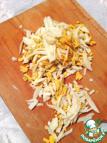 Так же тонкими полосочками нарезаем сваренные вкрутую яйца.