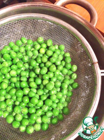 Бланшируем в кипятке зеленый горошек 2 минуты, затем обдаем ледяной водой для сохранения цвета.