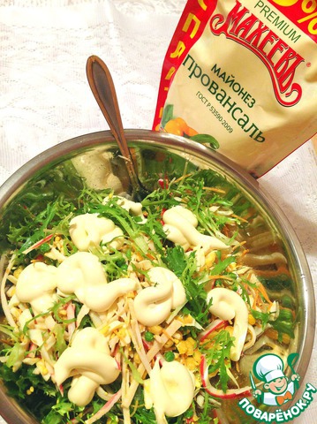 Добавляем майонез. Провансаль от "Махеевъ" замечательно подошел по-вкусу. Аккуратно перемешиваем движениями снизу вверх для сохранения структуры ингредиентов.