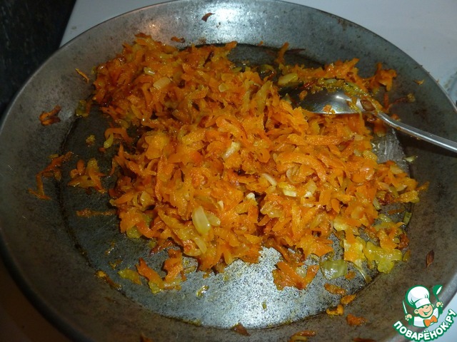 Натираем на терке свежую морковку, режем мелко лук и обжариваем на подсолнечном масле до золотистого цвета (как для бульона).