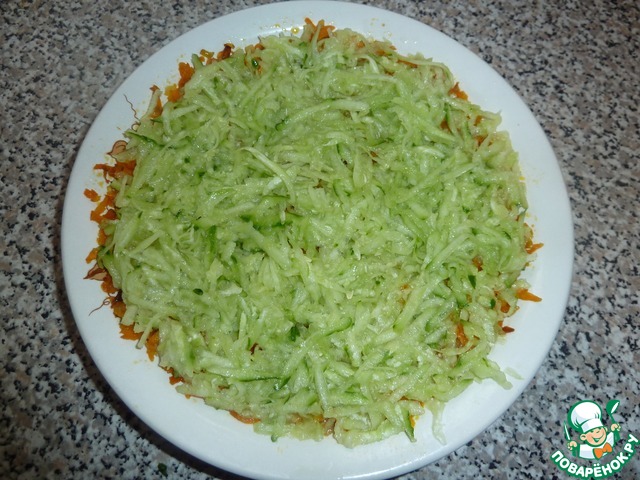 Натираем огурцы на крупной терке и укладываем тонким слоем на обжарку.