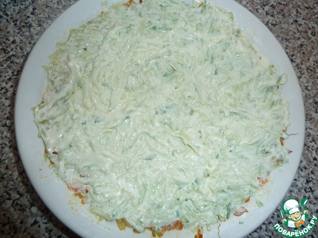 Добавляем в майонез соль, перемешиваем. Смазываем слой с огурцами.