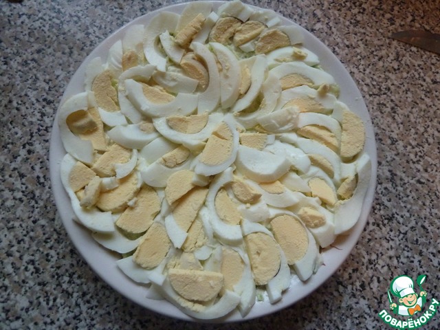 Нарезаем вареные яйца тонкими слоями. Я слой делю ещё на половинки и укладываю кругом.