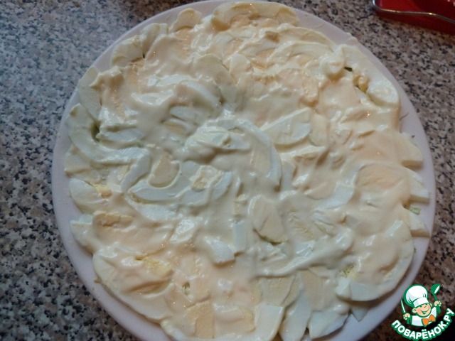 Смазываем слой яиц майонезом с солью.